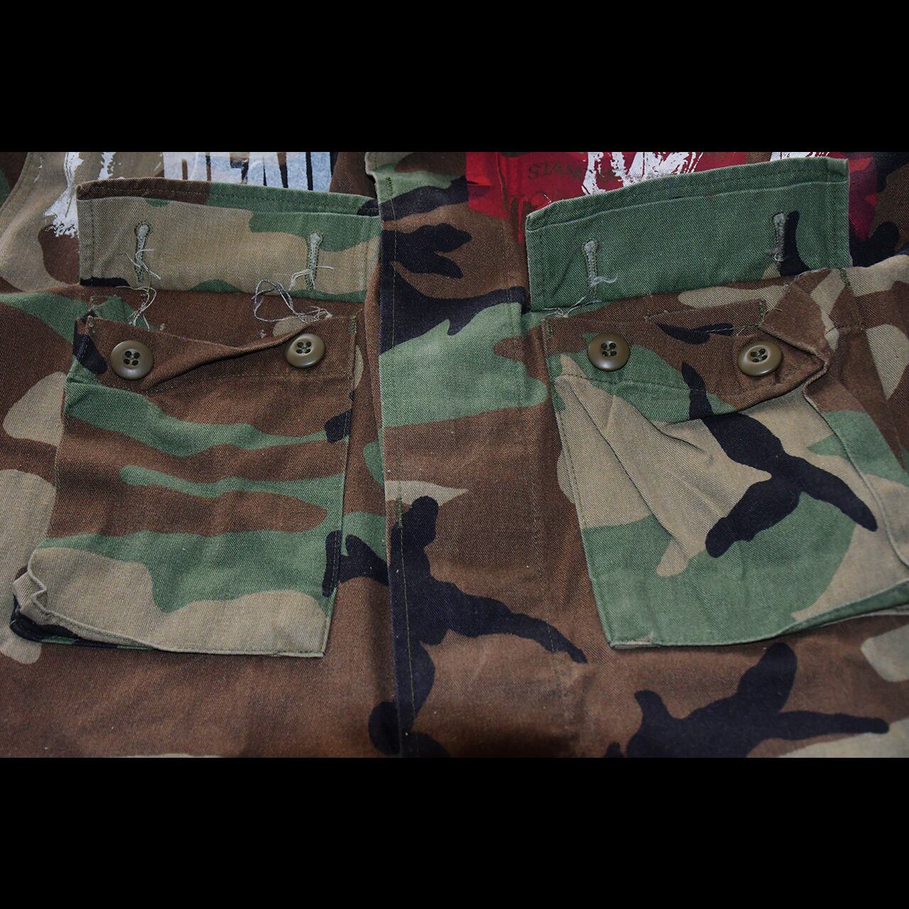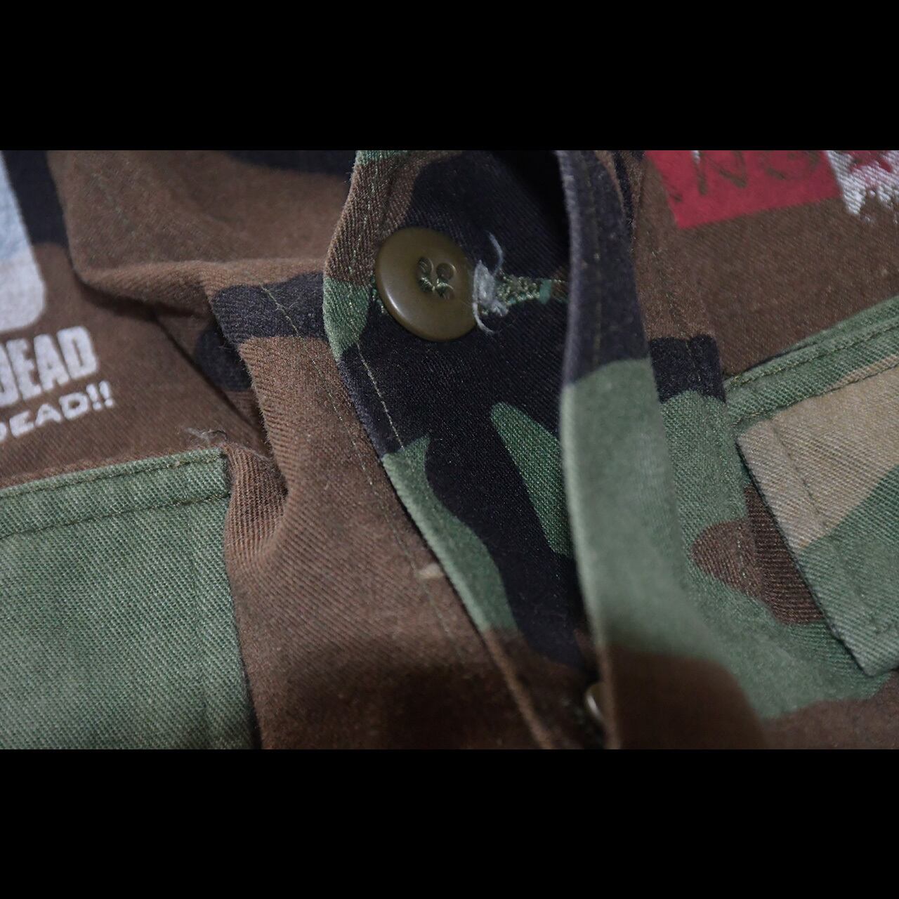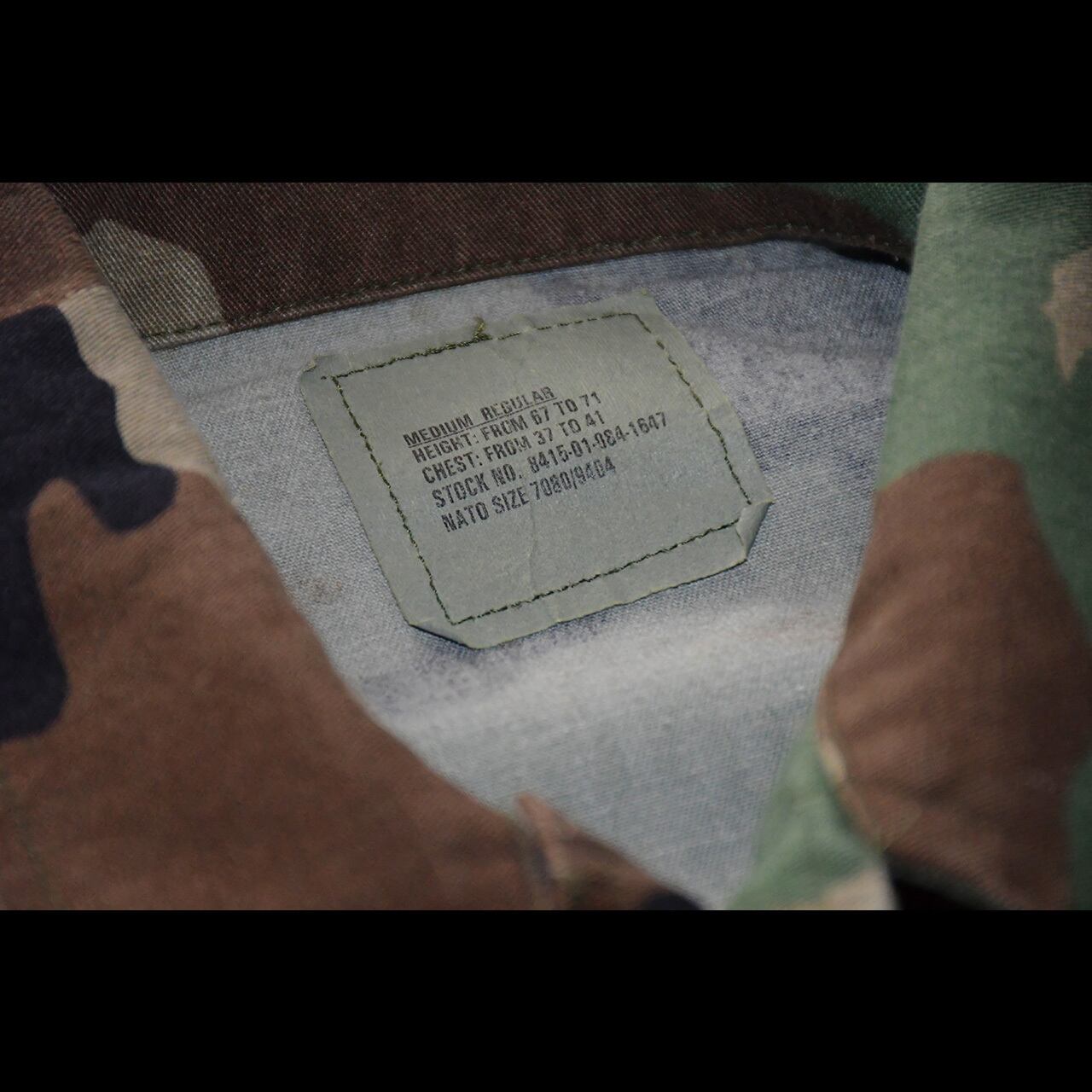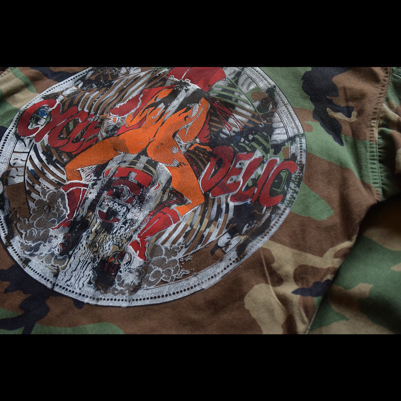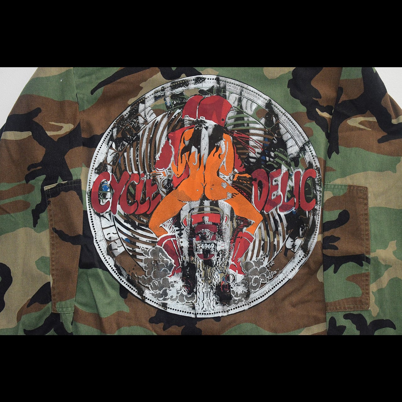 デッドストックのミリタリーアイテムに一点一点ハンドプリントしたミリタリーアートジャケット。バックプリントには、カレイドスコープシリーズのサイクルデリックをハンドプリントした作品。1981年より約30年以上にわたり全米軍で使用され、米海兵隊では2005年、米陸軍では2008年、米空軍では2011年、米海軍では2012年まで使用されたウッドランドカモ柄のBDU(野戦服)です。その後もアメリカ陸軍特殊部隊のグリーンベレーではウッドランドのBDUジャケットが限定で継続使用されていました。こちらの後期型の特徴としては、1995年以降に生産されたモデルで、胸ポケットとウエスト部分のポケットのマチが外側に設けられており、襟の形状が中期型以降は小さくなり、袖口の調節用タブは前期、中期、後期になるにつれて幅広で短い形状へと変更されました。BDUとは「Battle Dress Uniform」の略で、戦闘服のことであり、BDUジャケットの特徴とも言える4つのフロントポケットは2重構造のフラップがついており、ボタンが外に露出しない仕様です。4箇所のポケットはマチ付きで立体的なデザインになっています。フロントは比翼仕立てでボタンが引っかからない仕様、肘部分には補強のためにあて布がされた2重構造、袖はボタンで調節可能、左胸のポケットの内側にはペンホルダーが備わっており、細部にまでこだわり抜かれたデザインとなっています。NYCO(ナイコ)と呼ばれるコットン、ナイロンの混紡素材が使用されており、リップストップに比べ、こちらのノンリップのツイルタイプは放出される機会が少ない印象です。リップストップとノンリップは同じデザインでも雰囲気が変わりますので、その日の気分でお好みのタイプをセレクトして下さい。米軍のアイテムとして代表的なBDUジャケットですが、近年放出が少なくなり、年々希少価値が上がっており、入手することが非常に困難になってきたアイテムの1つです!新品には出せない風合いのよい生地のアタリやムラ感などが、他と被らない1点物のような魅力を感じていただけると思います。これから更に着込んでいただくことにより様々な表情を見せてくれる1枚です。