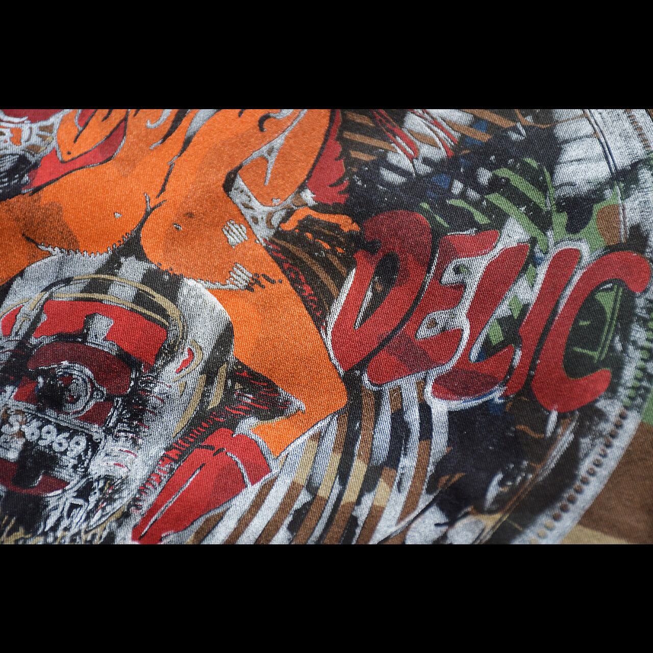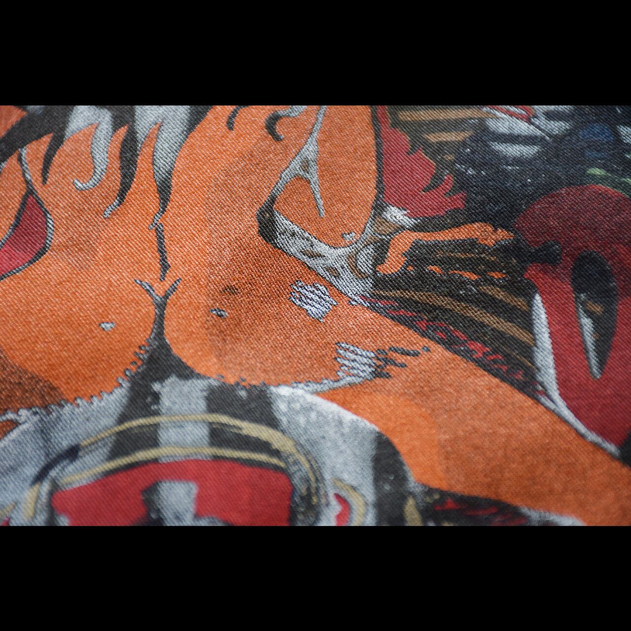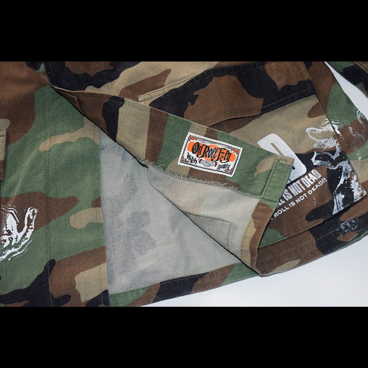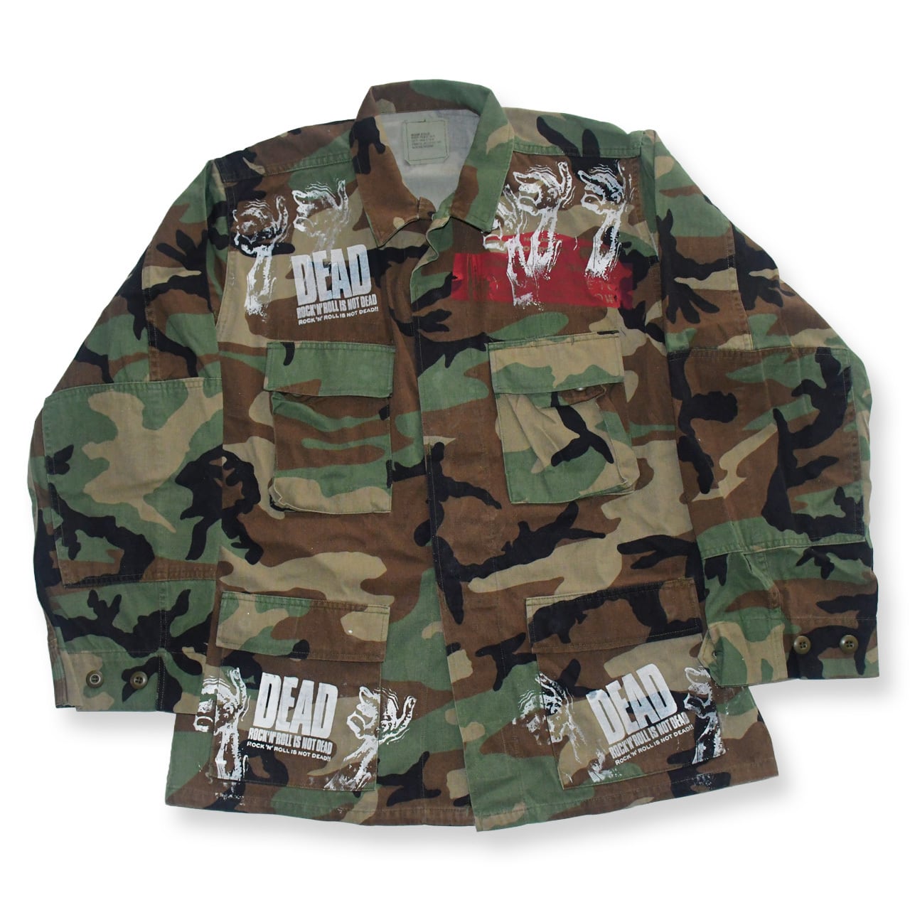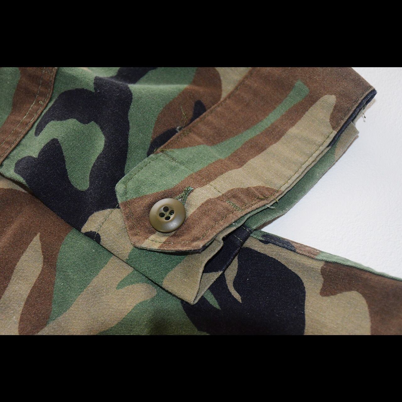デッドストックのミリタリーアイテムに一点一点ハンドプリントしたミリタリーアートジャケット。バックプリントには、カレイドスコープシリーズのサイクルデリックをハンドプリントした作品。1981年より約30年以上にわたり全米軍で使用され、米海兵隊では2005年、米陸軍では2008年、米空軍では2011年、米海軍では2012年まで使用されたウッドランドカモ柄のBDU(野戦服)です。その後もアメリカ陸軍特殊部隊のグリーンベレーではウッドランドのBDUジャケットが限定で継続使用されていました。こちらの後期型の特徴としては、1995年以降に生産されたモデルで、胸ポケットとウエスト部分のポケットのマチが外側に設けられており、襟の形状が中期型以降は小さくなり、袖口の調節用タブは前期、中期、後期になるにつれて幅広で短い形状へと変更されました。BDUとは「Battle Dress Uniform」の略で、戦闘服のことであり、BDUジャケットの特徴とも言える4つのフロントポケットは2重構造のフラップがついており、ボタンが外に露出しない仕様です。4箇所のポケットはマチ付きで立体的なデザインになっています。フロントは比翼仕立てでボタンが引っかからない仕様、肘部分には補強のためにあて布がされた2重構造、袖はボタンで調節可能、左胸のポケットの内側にはペンホルダーが備わっており、細部にまでこだわり抜かれたデザインとなっています。NYCO(ナイコ)と呼ばれるコットン、ナイロンの混紡素材が使用されており、リップストップに比べ、こちらのノンリップのツイルタイプは放出される機会が少ない印象です。リップストップとノンリップは同じデザインでも雰囲気が変わりますので、その日の気分でお好みのタイプをセレクトして下さい。米軍のアイテムとして代表的なBDUジャケットですが、近年放出が少なくなり、年々希少価値が上がっており、入手することが非常に困難になってきたアイテムの1つです!新品には出せない風合いのよい生地のアタリやムラ感などが、他と被らない1点物のような魅力を感じていただけると思います。これから更に着込んでいただくことにより様々な表情を見せてくれる1枚です。