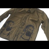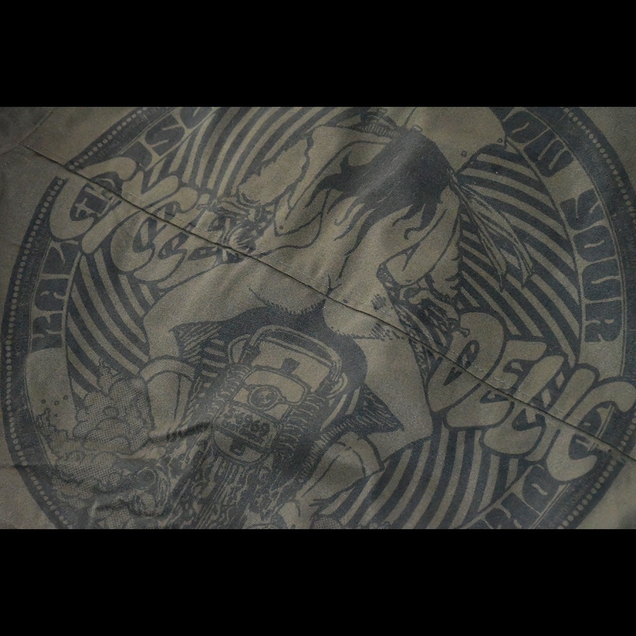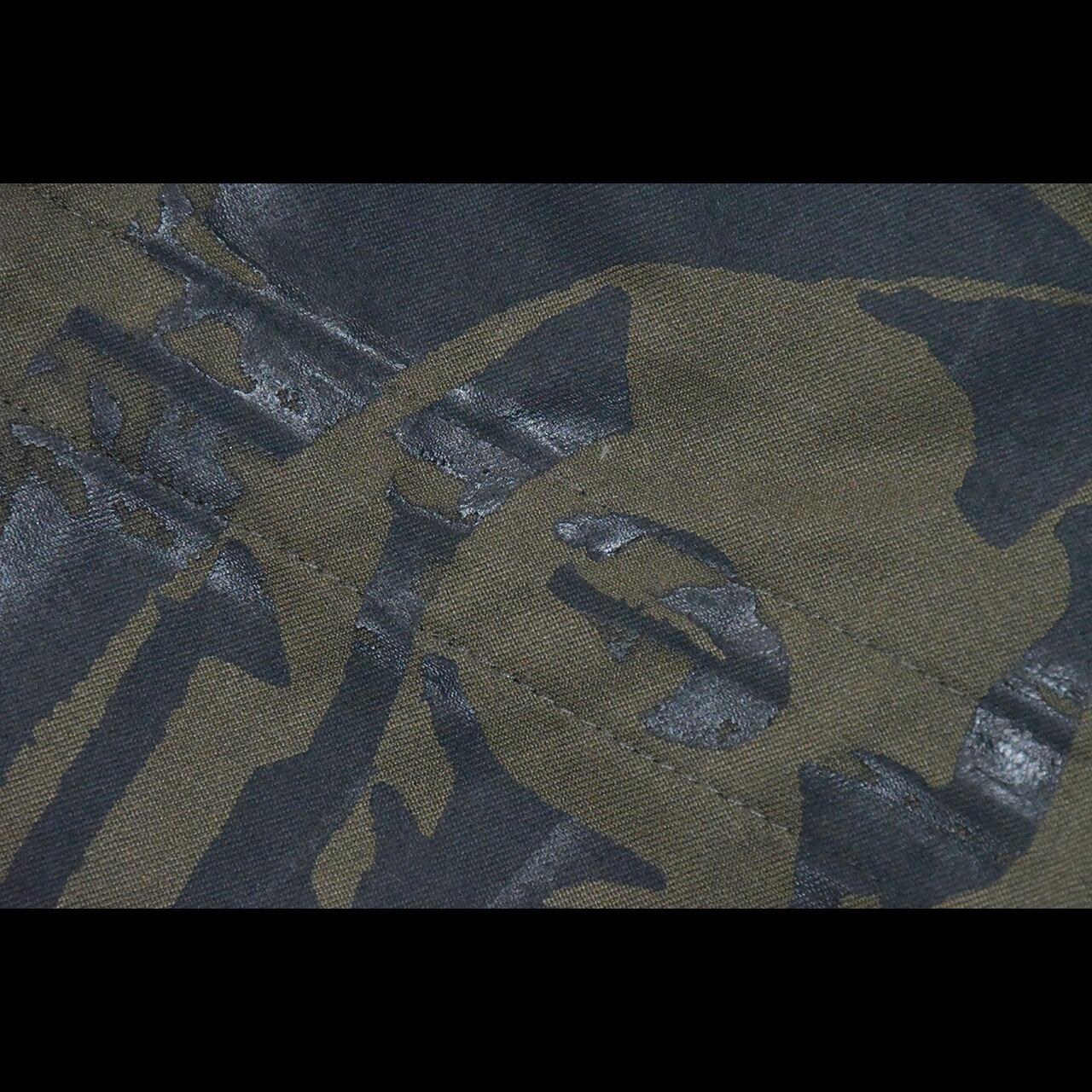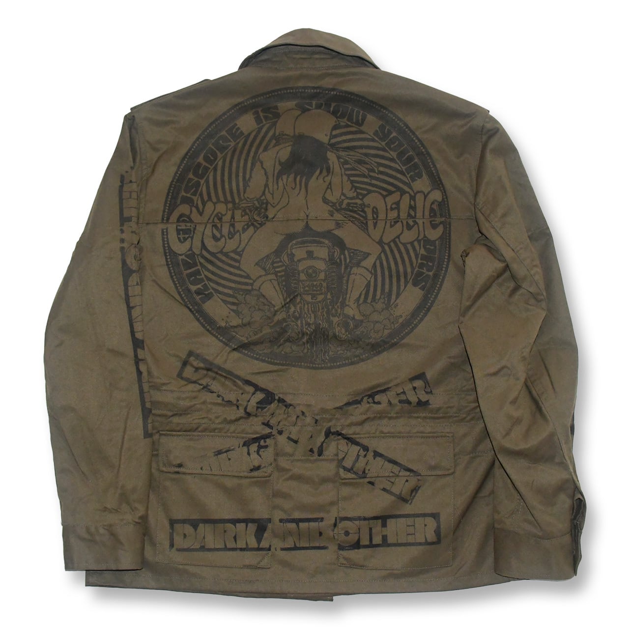 デッドストックのミリタリーアイテムに一点一点ハンドプリントしたミリタリーアートジャケット。表面のプリントには、ヴィンテージでも大変希少なzigzagを大胆にハンドプリントをし、バックプリントには、カレイドスコープシリーズのサイクルデリックをハンドプリントした作品。