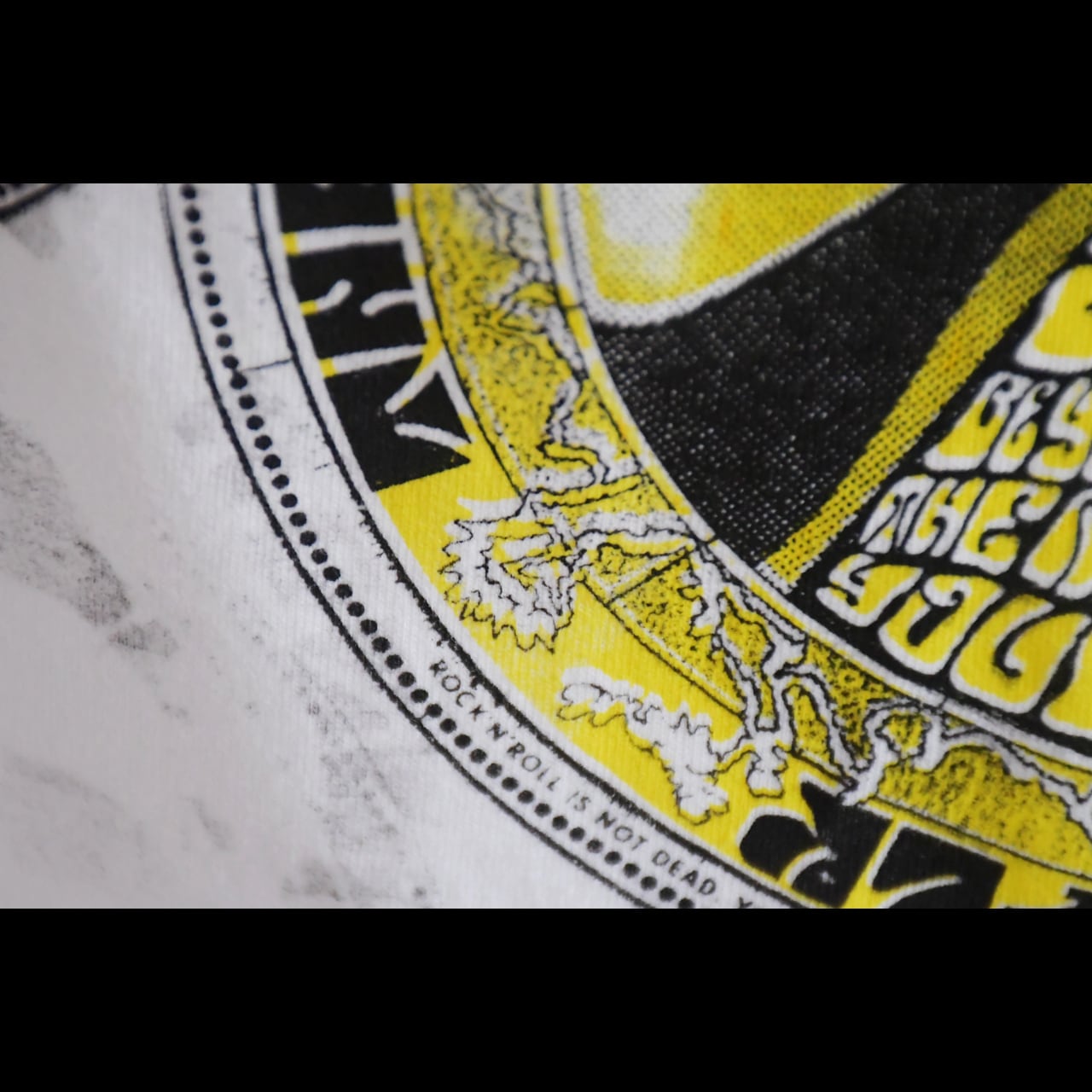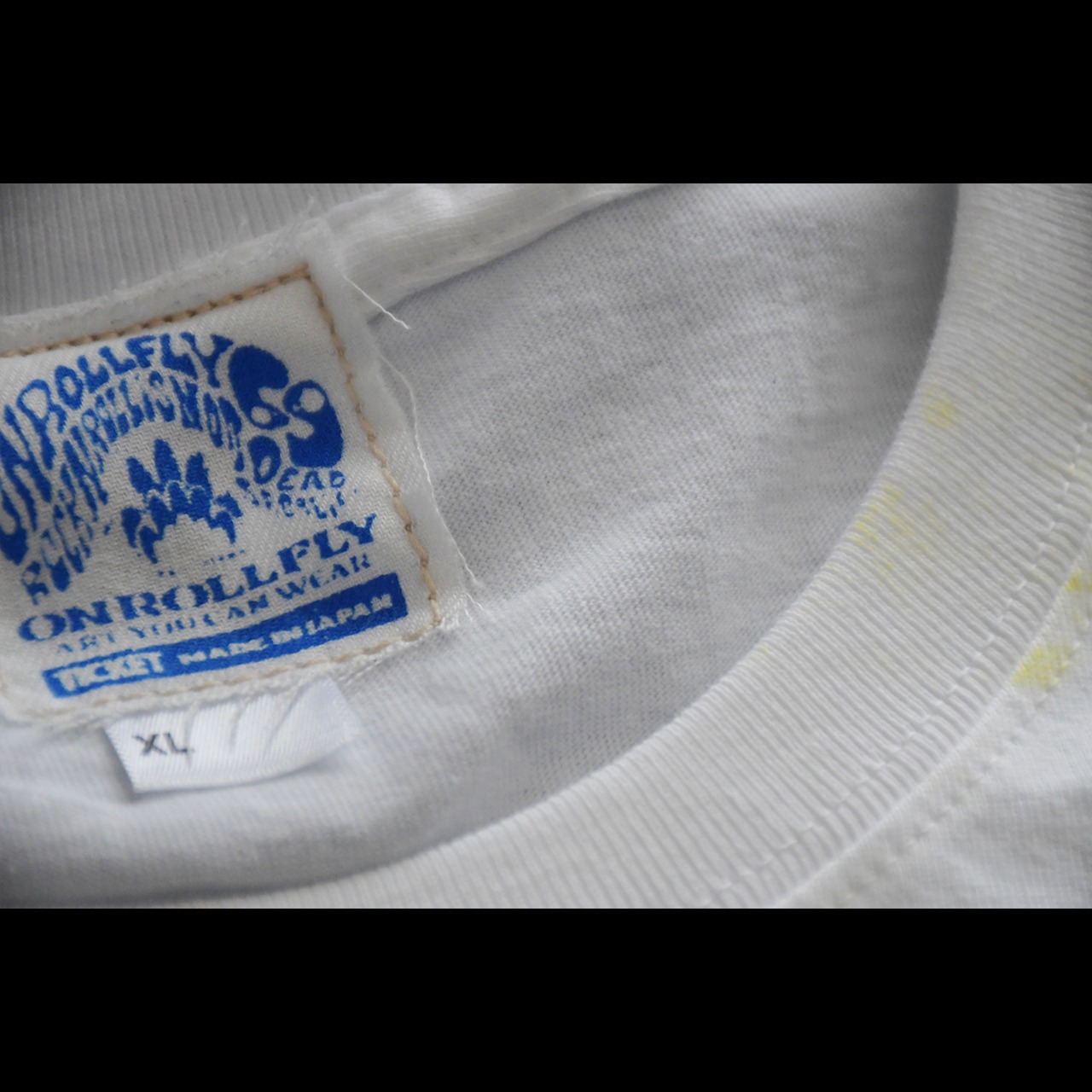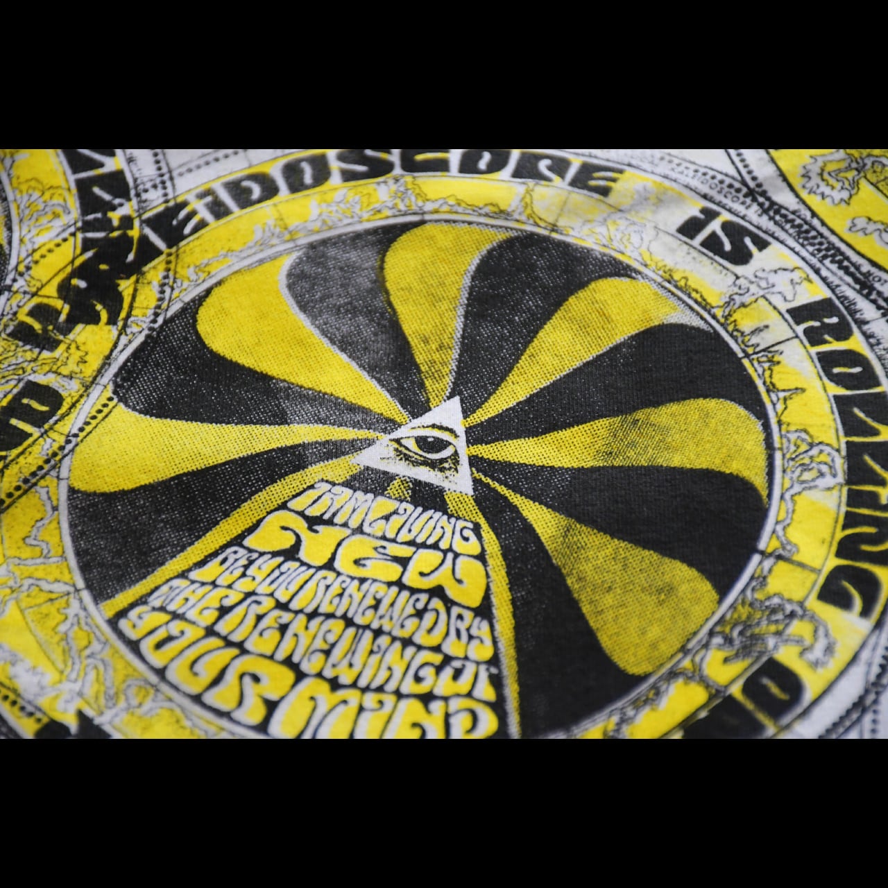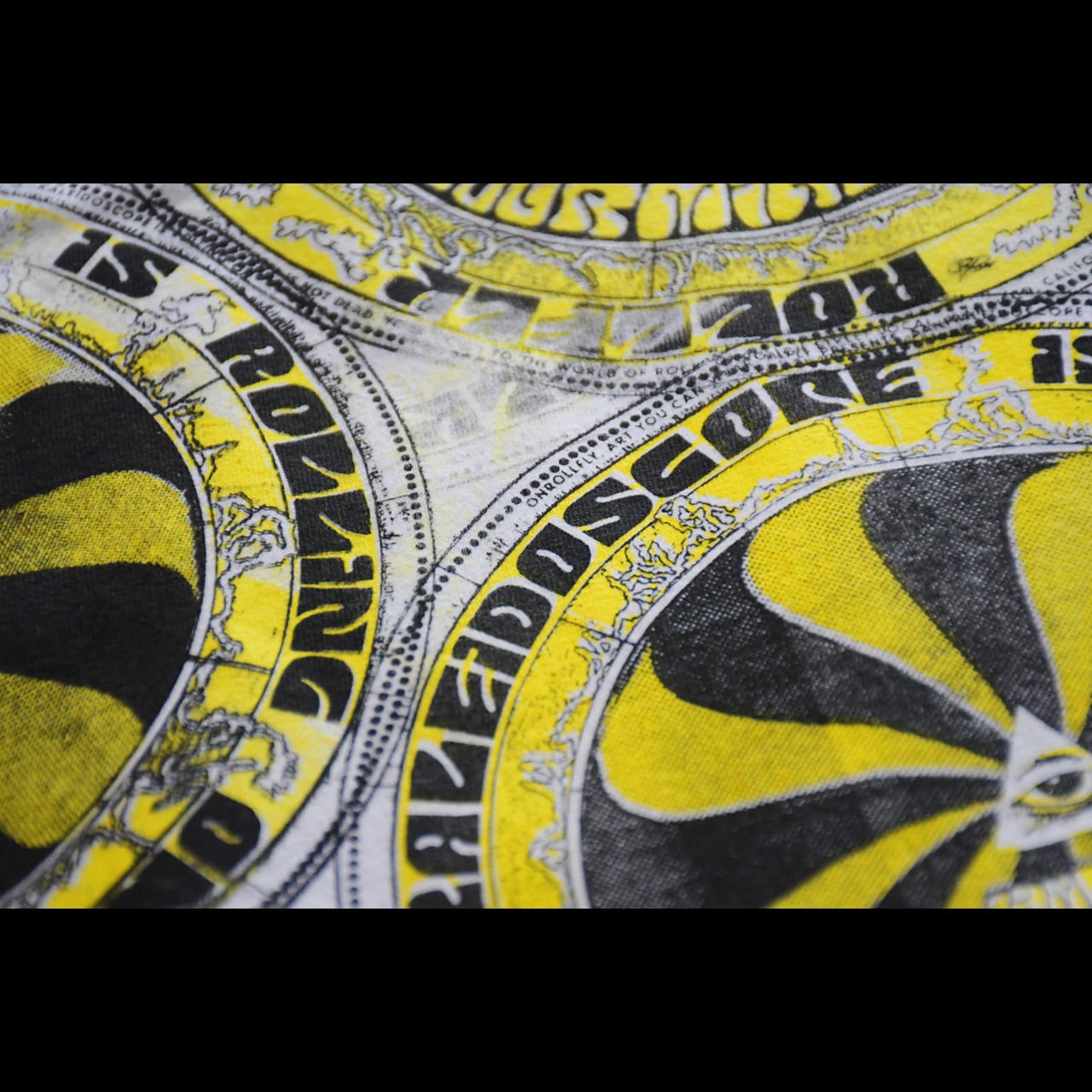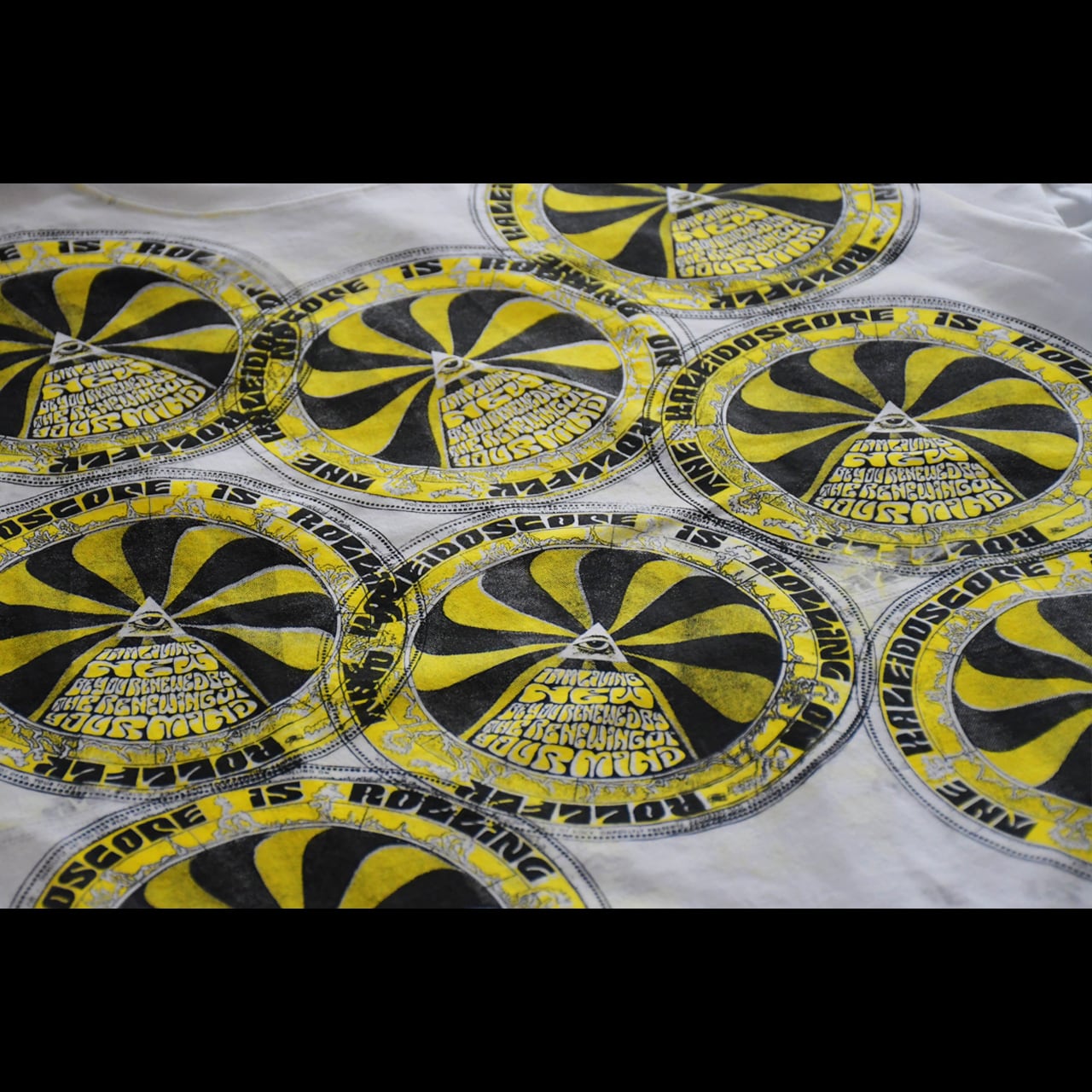 視点を変えるたびに見える景色は変わり、同じ瞬間には二度と出会えない。本作は60年代ロックポスターの幻影を辿りながら、オンロールフライが描き起こした“現代のカレイドスコープ”である。中心へ収束する構造の中に描かれた「i am living new. be you renewed by the renewing of your mind」という英文は、1960年代特有の書体で描き、「新しい人生は、新しい考え方から始まる」というメッセージを表している。損得、流行、他人の目といった世の中の“型”に自分を合わせるのではなく、自分の内側の思考を更新することで、生き方そのものを新しくしていく。放射状に広がるパターンは万華鏡の構造をもとに、60年代サイケデリックポスターの視覚的な揺らぎを再構築したもの。歪みながら回転する文字と形は、固定された価値観がほどけ、新しく組み替わっていく意識の変化を象徴している。すべて鉛筆から描き起こされ、手作業で版に刻まれ、刷るたびにわずかに異なる表情を持つ。ONROLLFLYのカレイドスコープは、着る人の視点とともに回転し、見るたびに新しい意味を生み出していく。この新シーズンに意味合いも含めてぴったりな作品になっています。