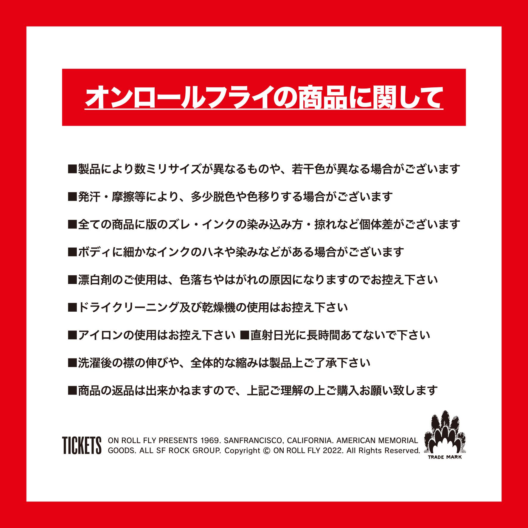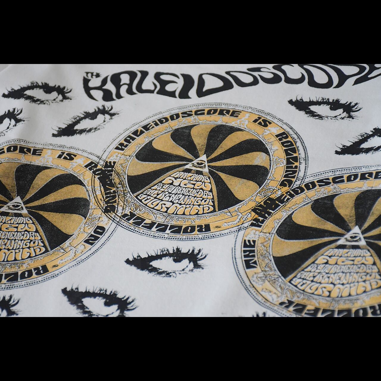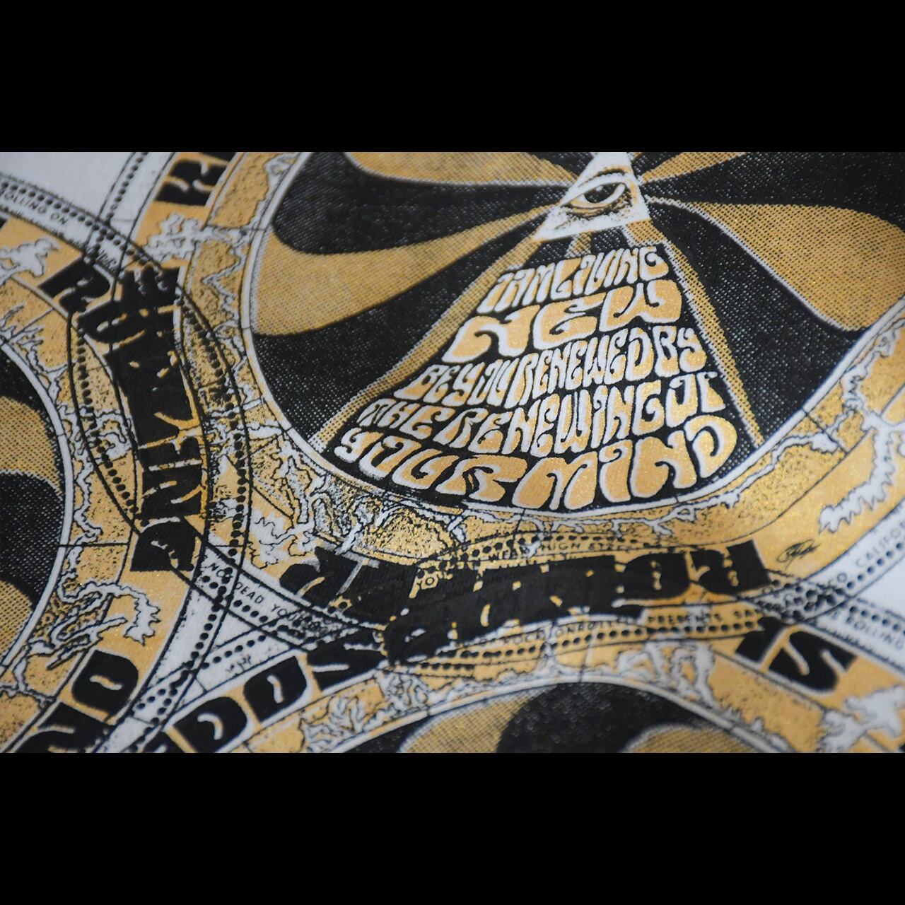 視点を変えるたびに見える景色は変わり、同じ瞬間には二度と出会えない。本作は60年代ロックポスターの幻影を辿りながら、オンロールフライが描き起こした“現代のカレイドスコープ”である。中心へ収束する構造の中に描かれた「i am living new. be you renewed by the renewing of your mind」という英文は、1960年代特有の書体で描き、「新しい人生は、新しい考え方から始まる」というメッセージを表している。損得、流行、他人の目といった世の中の“型”に自分を合わせるのではなく、自分の内側の思考を更新することで、生き方そのものを新しくしていく。放射状に広がるパターンは万華鏡の構造をもとに、60年代サイケデリックポスターの視覚的な揺らぎを再構築したもの。歪みながら回転する文字と形は、固定された価値観がほどけ、新しく組み替わっていく意識の変化を象徴している。すべて鉛筆から描き起こされ、手作業で版に刻まれ、刷るたびにわずかに異なる表情を持つ。ONROLLFLYのカレイドスコープは、着る人の視点とともに回転し、見るたびに新しい意味を生み出していく。この新シーズンに意味合いも含めてぴったりな作品になっています。