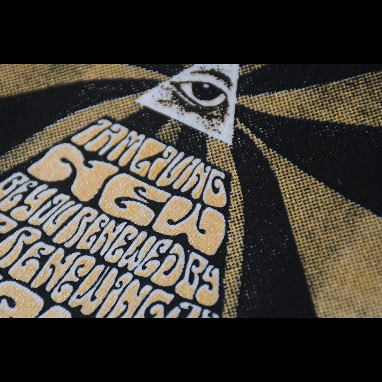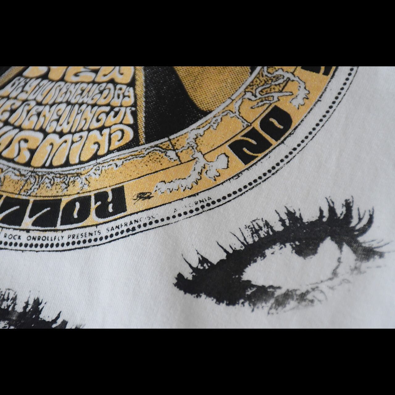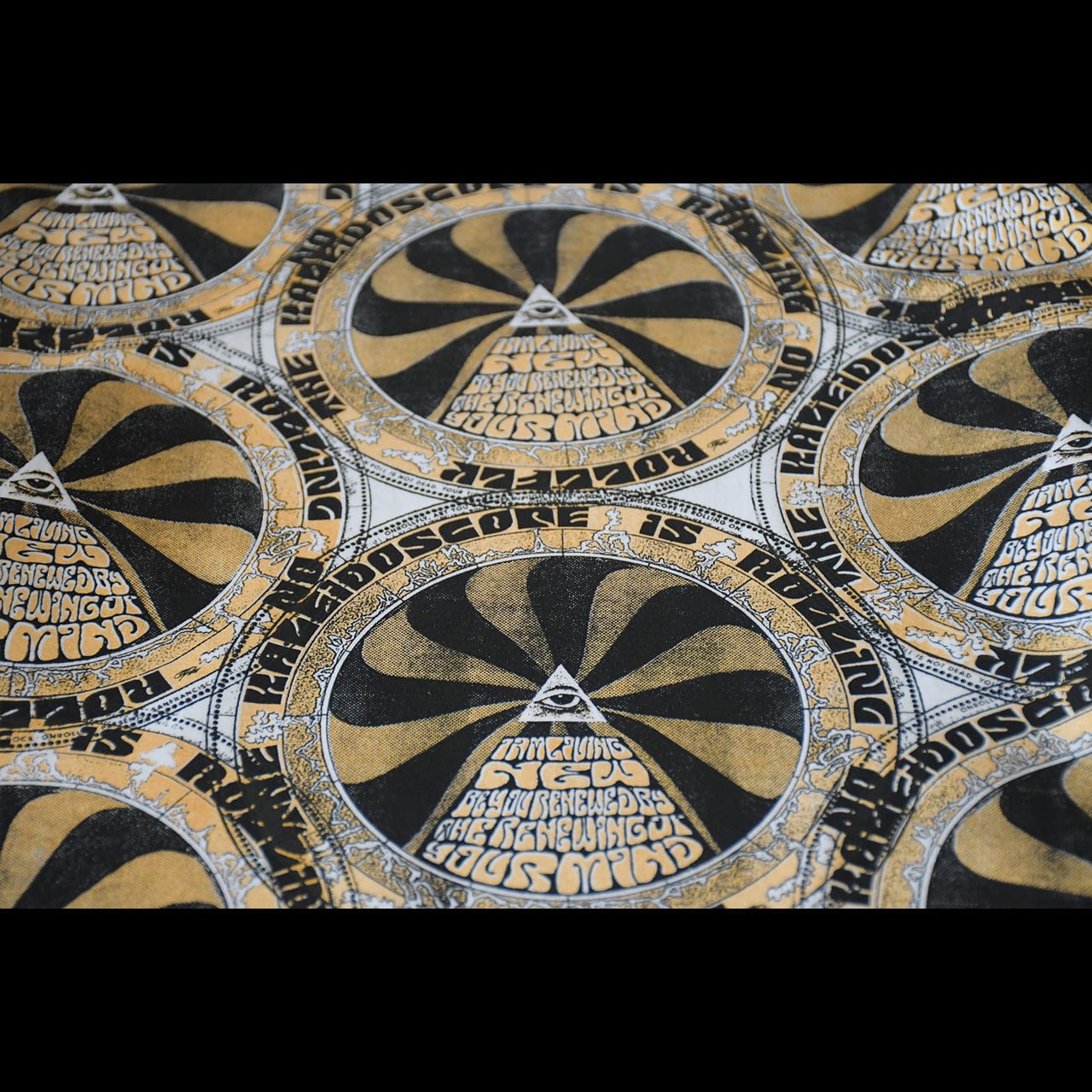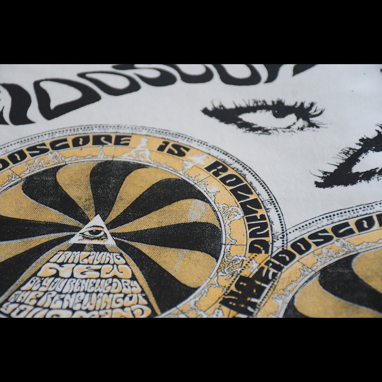 視点を変えるたびに見える景色は変わり、同じ瞬間には二度と出会えない。本作は60年代ロックポスターの幻影を辿りながら、オンロールフライが描き起こした“現代のカレイドスコープ”である。中心へ収束する構造の中に描かれた「i am living new. be you renewed by the renewing of your mind」という英文は、1960年代特有の書体で描き、「新しい人生は、新しい考え方から始まる」というメッセージを表している。損得、流行、他人の目といった世の中の“型”に自分を合わせるのではなく、自分の内側の思考を更新することで、生き方そのものを新しくしていく。放射状に広がるパターンは万華鏡の構造をもとに、60年代サイケデリックポスターの視覚的な揺らぎを再構築したもの。歪みながら回転する文字と形は、固定された価値観がほどけ、新しく組み替わっていく意識の変化を象徴している。すべて鉛筆から描き起こされ、手作業で版に刻まれ、刷るたびにわずかに異なる表情を持つ。ONROLLFLYのカレイドスコープは、着る人の視点とともに回転し、見るたびに新しい意味を生み出していく。この新シーズンに意味合いも含めてぴったりな作品になっています。