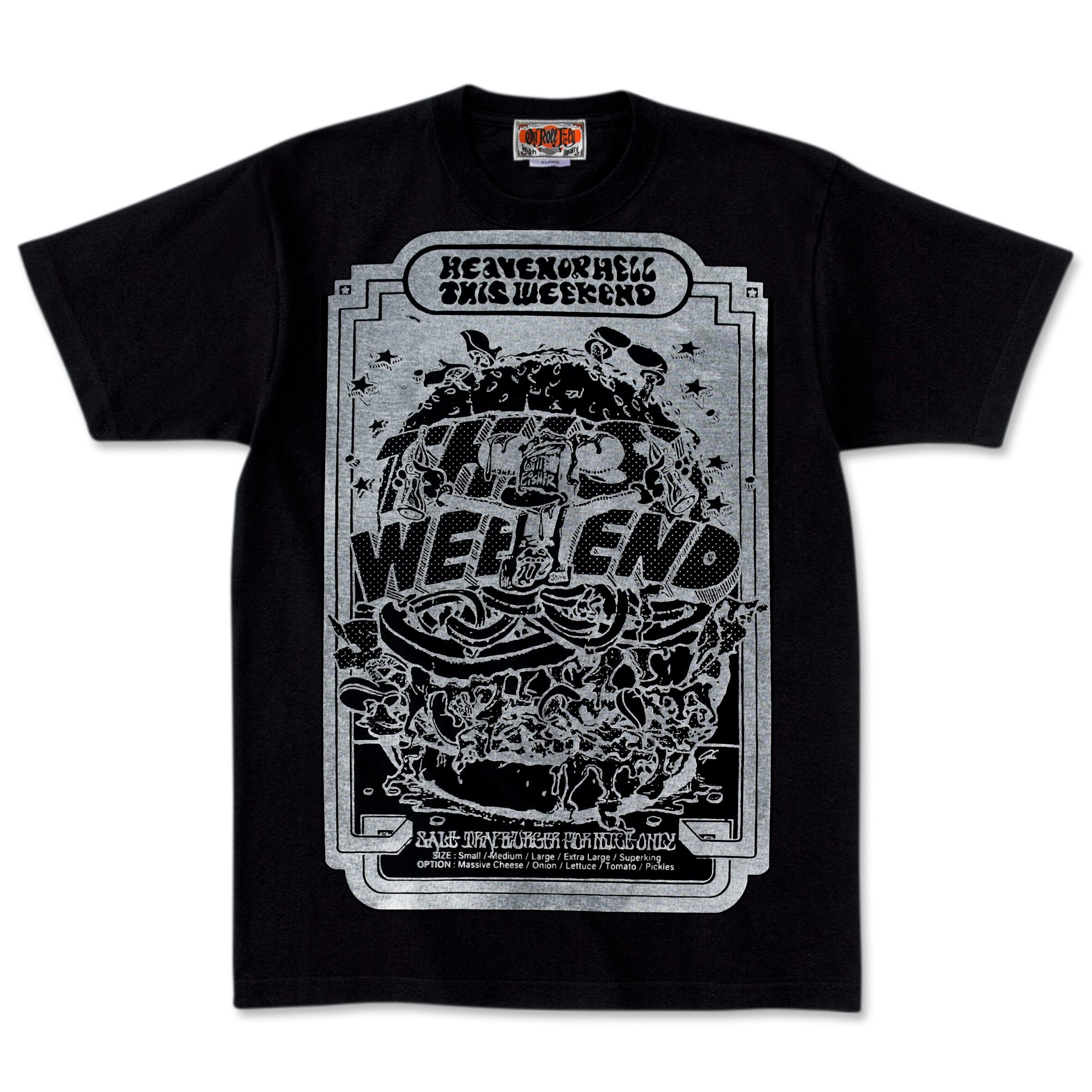 アメリカ合衆国を代表する国民食ハンバーガーをトラップバーガーと題したデザイン。食べ過ぎ・飲み過ぎ・羽目を外してしまうと危険ということを訴えかけ、ネズミ取りと掛け合わせたデザインになっている。「HEAVEN OR HELL. THIS WEEKEND」この週末、天国か地獄か。という意味を持ち、週末になると開催されるイベントやパーティーを別の角度から取り上げた作品になっている。トラップバーガーに囚われている生き物はどこかで見たことがあるようなないような。まさかと思うような出来事も起こってしまう世の中ということも示している。ハンバーガーのトッピングであるオニオンは、手錠のロックをイメージし、チーズはボンドとして、ネズミ捕獲の餌としてジョークも取り入れた作品に仕上げている。アメリカンらしいスペシャルな一枚は、この夏を彩るポップなアイテムの一つになる。